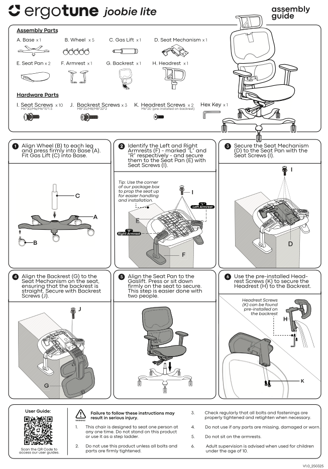 Assembling your Joobie Lite is quick and straightforward, with just a few easy steps to get you seated comfortably in no time. This guide provides clear, step-by-step instructions along with visuals to ensure a smooth setup process. No special tools are required—everything you need is included in the box. Set aside about 15–20 minutes, and you’ll be ready to enjoy ergonomic support with ease.